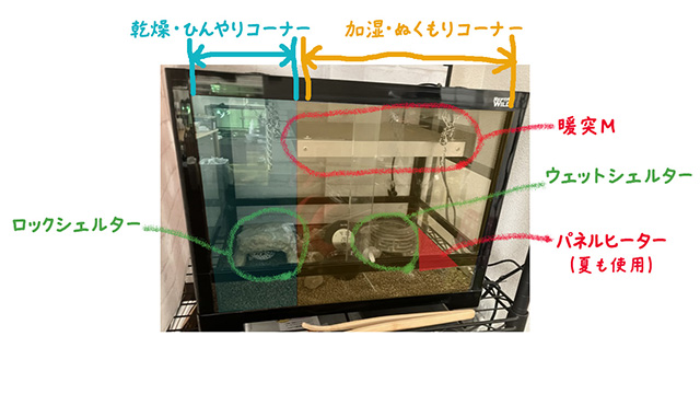 レオパ1匹にしては広いケージかなとは思いますが、温度勾配がつけやすいのでこの広さにしています。