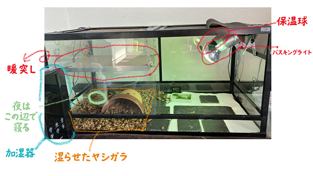 我が家ではケージが置いてあるリビングの室温をエアコンで上げつつ、それぞれの生き物のケージ内の設備で適温に調整しています。