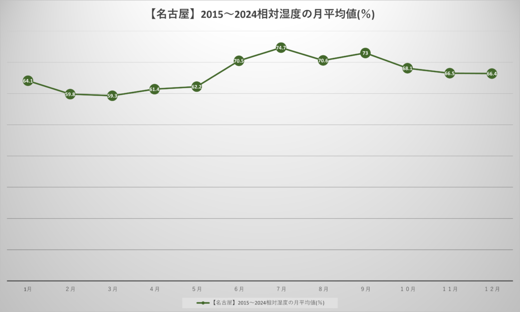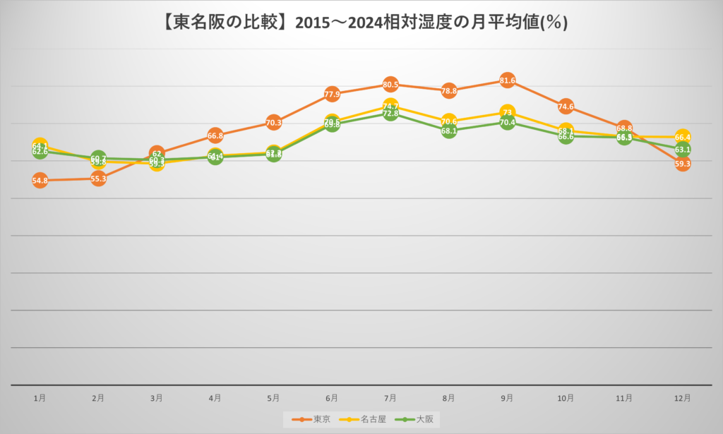 2015年~2024年の10年間の東京・名古屋・大阪の相対湿度の月ごとの平均値を算出してグラフにしてみました。