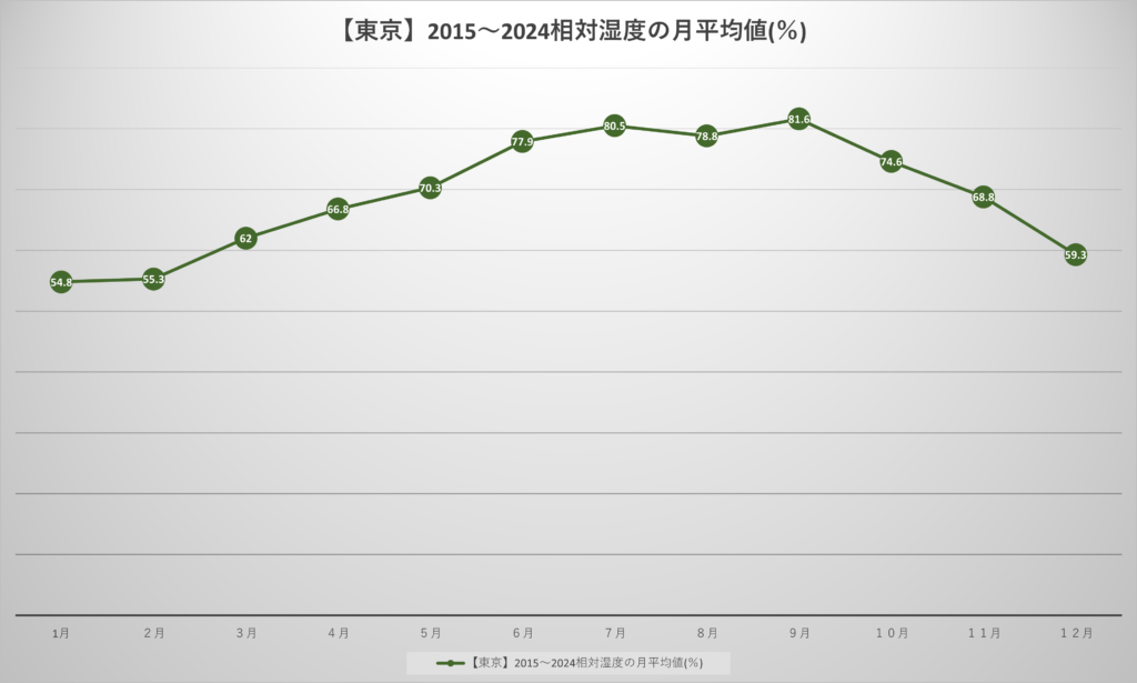 グラフを出してみてびっくりしましたが、意外にも1年の中で最も湿度が低いです。