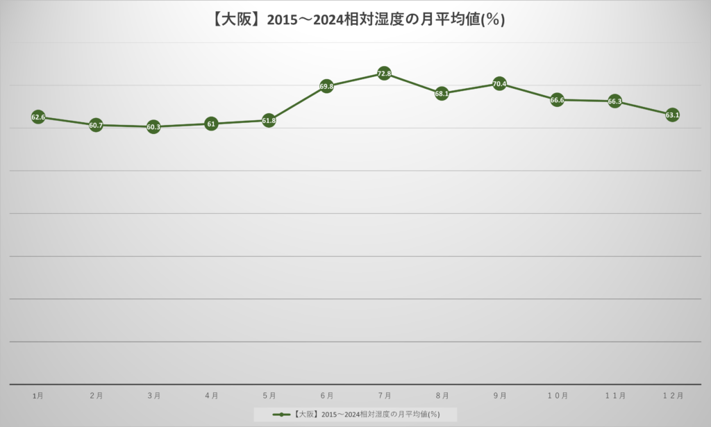大阪も名古屋と似たようなグラフ形状で、こちらも3月が1年の中で最も湿度が低いです。