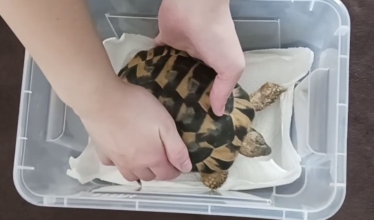 ちゃわん🐢は、移動用プラケースにキッチンペーパーを集めに敷いて、爬虫類用キャリーバッグに入れました。