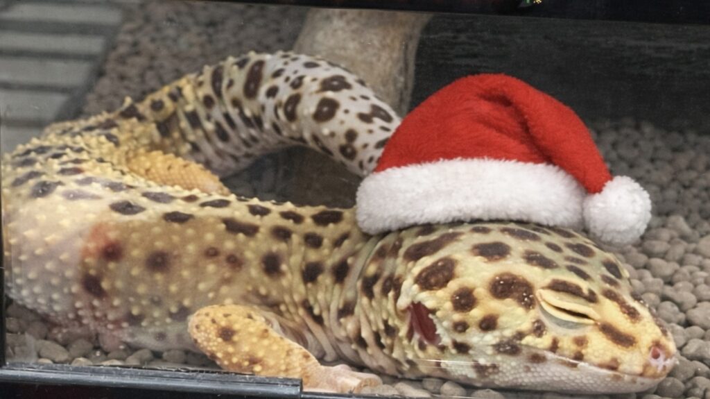 ぷぷ🦎はフィギュアやツリーはびっくりして怒っちゃうので、AIの力でサンタ帽をかぶせてもらいました🎅